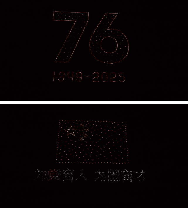 “为党育人,为国育才”“强国有我,请党放心”......活动当晚,一场由在校学生主导的航空文化主题晚会压轴登场。其中最引人注目的环节是由学生编程操控的无人机表演队,以夜空为幕,通过精准的编队飞行与灯光变换,生动演绎爱国主题篇章,展现青年学子的科技应用能力与家国情怀,为整场活动画上精彩句点。