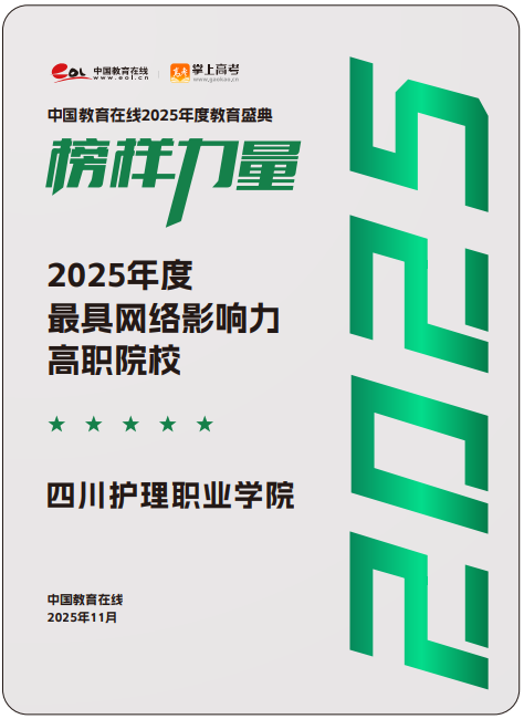 近日,中国教育在线“榜样力量·2025年度教育盛典”优秀案例名单公布。四川护理职业学院凭借极具创新性与前瞻性的招生宣传策略,以及扎实过硬的宣传执行实力,从众多高校中突围,获评“2025年度最具网络影响力高职院校”。