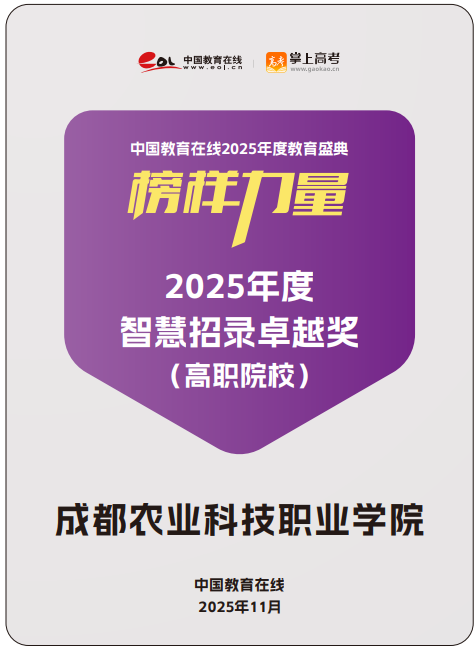 近日,中国教育在线“榜样力量·2025年度教育盛典”优秀案例名单公布。成都农业科技职业学院凭借在招录工作中对智慧招录相关技术工具的高水平运用及卓越成果,获评“2025年度智慧招录卓越奖(高职院校)”。