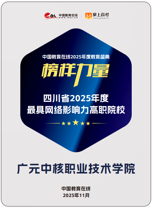 近日,中国教育在线“榜样力量·2025年度教育盛典”优秀案例名单公布。广元中核职业技术学院凭借极具创新性与前瞻性的招生宣传策略,以及扎实过硬的宣传执行实力,从众多高校中突围,获评“四川省2025年度最具网络影响力高职院校”。