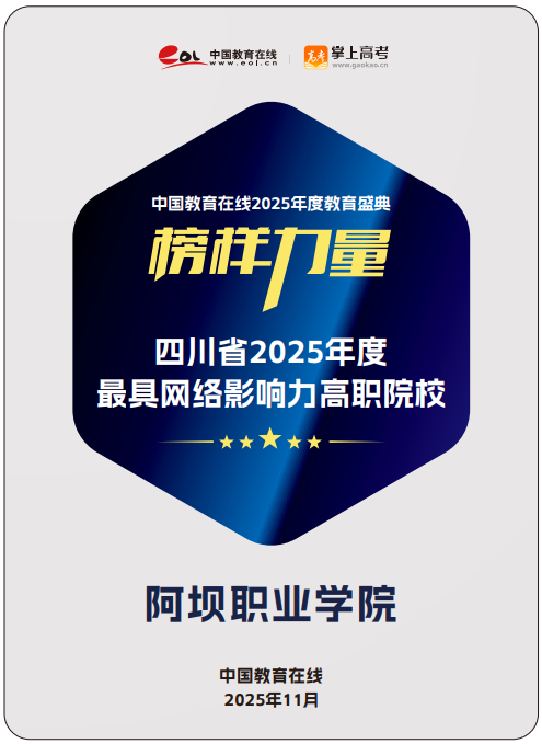 近日,中国教育在线“榜样力量·2025年度教育盛典”优秀案例名单公布。阿坝职业学院凭借极具创新性与前瞻性的招生宣传策略,以及扎实过硬的宣传执行实力,从众多高校中突围,获评“四川省2025年度最具网络影响力高职院校”。