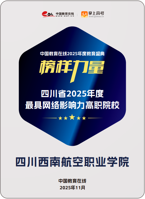 近日,中国教育在线“榜样力量·2025年度教育盛典”优秀案例名单公布。四川西南航空职业学院凭借极具创新性与前瞻性的招生宣传策略,以及扎实过硬的宣传执行实力,从众多高校中突围,获评“四川省2025年度最具网络影响力高职院校”。
