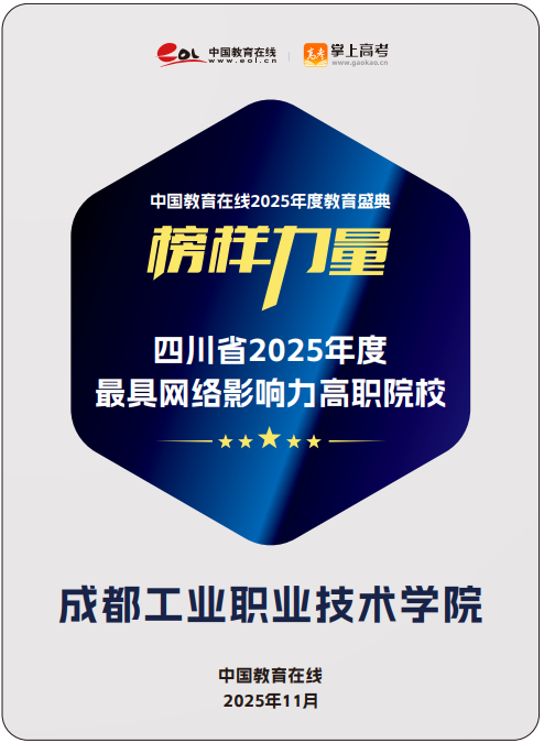 近日,中国教育在线“榜样力量·2025年度教育盛典”优秀案例名单公布。成都工业职业技术学院凭借极具创新性与前瞻性的招生宣传策略,以及扎实过硬的宣传执行实力,从众多高校中突围,获评“四川省2025年度最具网络影响力高职院校”。