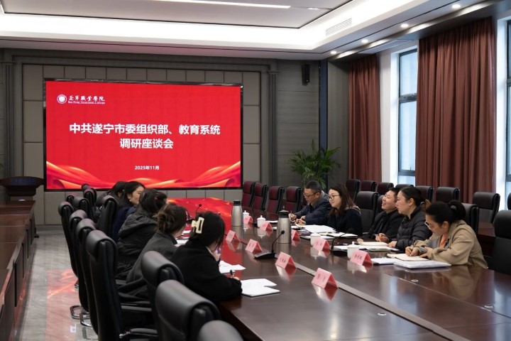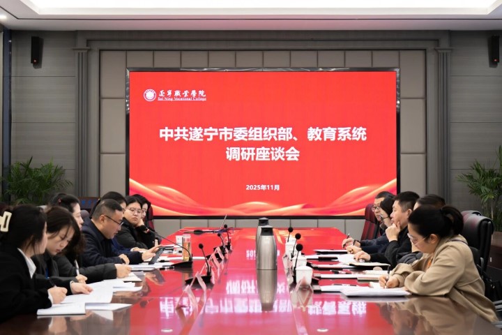 近日,中共遂宁市委组织部联合市教育系统莅临遂宁职业学院,开展专题调研座谈会。此次调研旨在把脉学校职业教育发展现状,共商人才培养大计,推动产教融合深入发展。中共遂宁市委组织部部务委员张山东,市教育局职业教育与成人教育(高等教育)科科长朱琳,市委组织部市高端人才服务中心干部姚惠玲,遂宁市教师发展中心副主任余彩虹,遂宁市船山区教育局人事股干事罗中军,学校执行校长刘志东,副校长龙春艳,党政办公室、教务处、学生工作处等相关部门负责人,人事处代表共同参会。座谈会上,刘志东校长全面汇报了办学成果,政校双方围绕关键议题进行了深入交流并凝聚了重要共识。