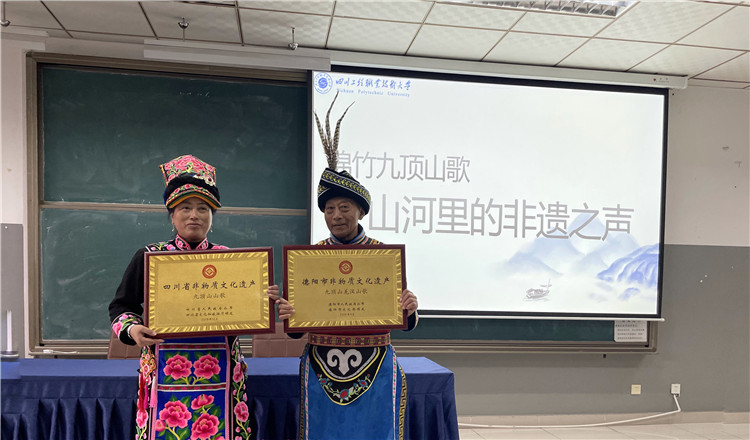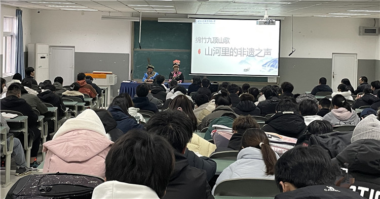 12月3日下午,四川工程职业技术大学教育学院举办“山河里的非遗之声”中华优秀传统文化进校园活动,本次活动邀请到绵竹市清平镇省级非遗传承人、九顶山山歌协会会长孟开金与副会长蒋礼会,为全院师生带来了一场主题为《绵竹九顶山歌——山河里的非遗之声》的精彩讲座,让全场师生沉浸式地感受了非遗文化的独特魅力。