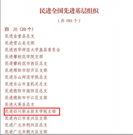 12月9日上午,庆祝民进成立80周年全国先进组织、优秀会员表彰大会在京召开。民进四川职业技术学院支部凭借扎实履职成效,被授予“民进全国先进基层组织”称号。