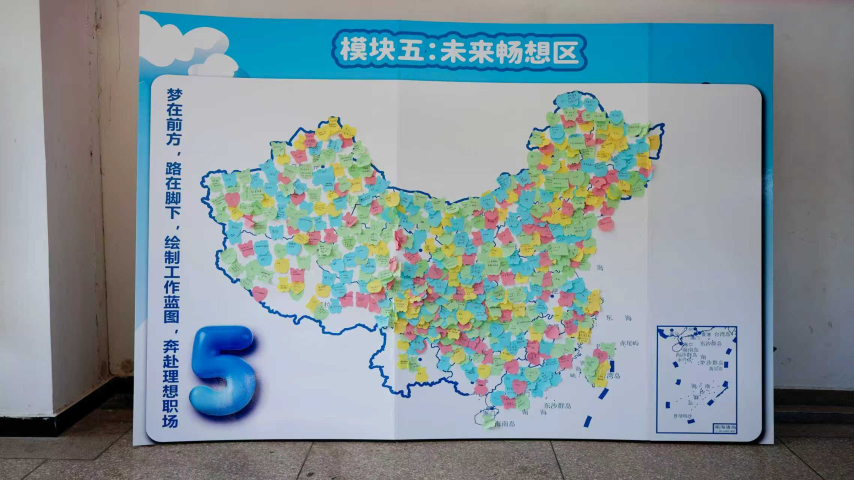 本次活动在“未来畅想区”设置了绘制有中国地图的展板,同学们在便利贴中写下对于就业发展的目标和对未来的期许,并黏贴到自己想去的就业地点,直观展示了同学们的求职热情和对理想工作的向往。在心中种下一颗梦想的种子,在就业舞台实现人生价值。