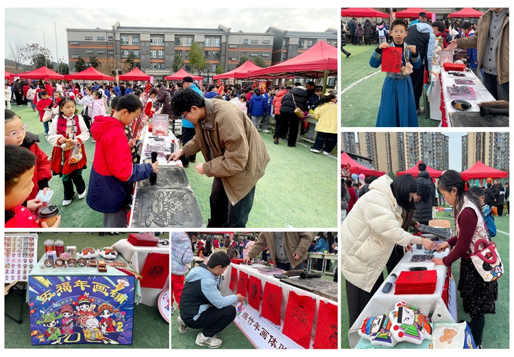 活动现场,工坊以“五福年画铺”为主题,精心打造一个集技艺体验、文创展售的非遗文化展演区,全方位呈现工坊近年来深耕绵竹年画文化传承与创新的系列成果,吸引了众多师生和家长的关注与参与,成为本次年货节上一道独特的风景线。