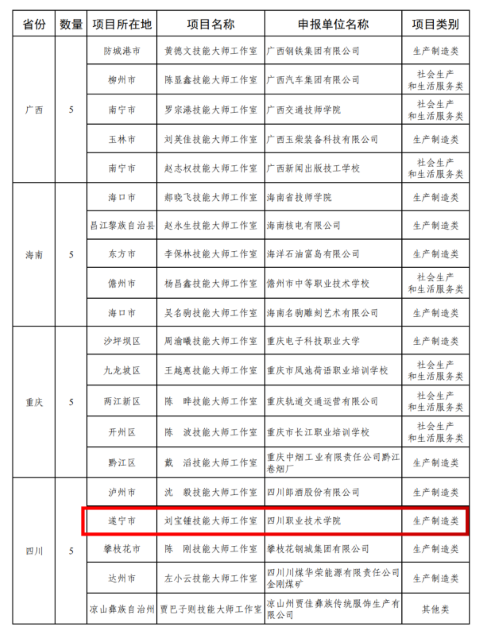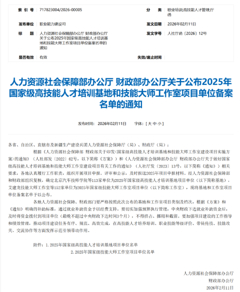 近日,人力资源社会保障部、财政部联合印发《关于公布2025年国家级高技能人才培训基地和技能大师工作室项目单位备案名单的通知》(人社厅函〔2026〕12号),正式公布本年度国家级技能大师工作室建设项目单位名单。四川职业技术学院申报的“刘宝锺技能大师工作室”凭借扎实的技术积累、突出的育人成效和显著的产教融合成果,成功获批国家级技能大师工作室。这是学校在高技能人才平台建设方面取得的又一重大突破,标志着学校在高技能人才队伍建设、产教深度融合及技术创新服务平台构建上迈上新台阶,正式迈入国家级技能人才培养高地行列。