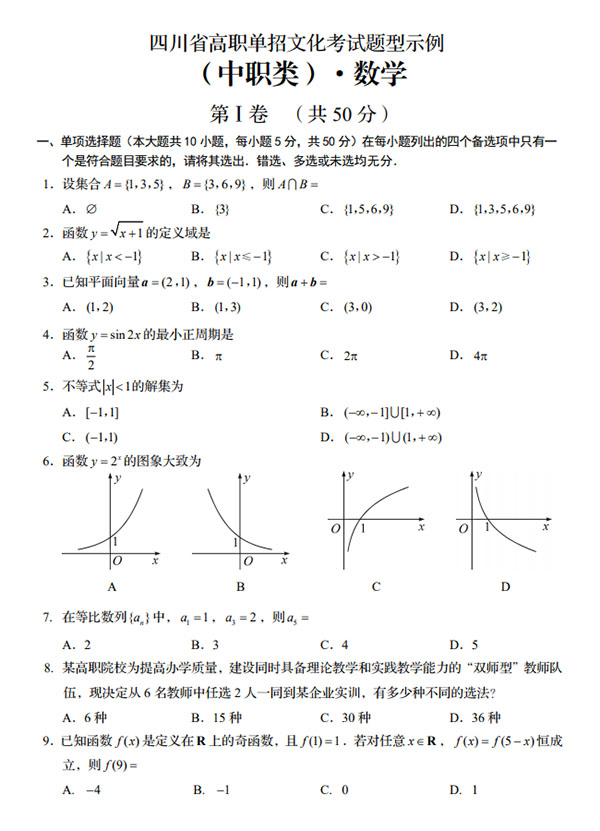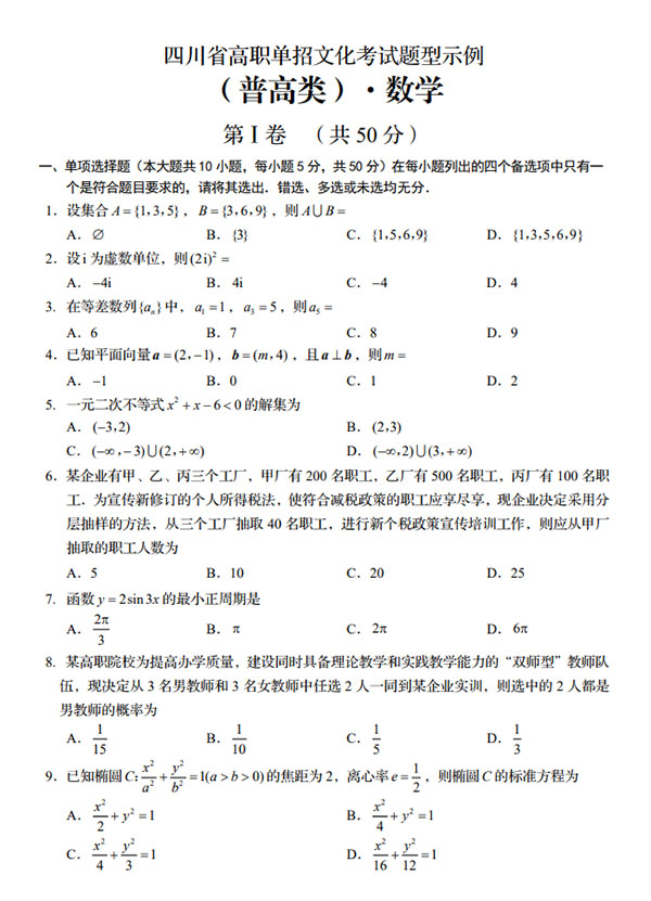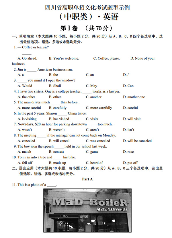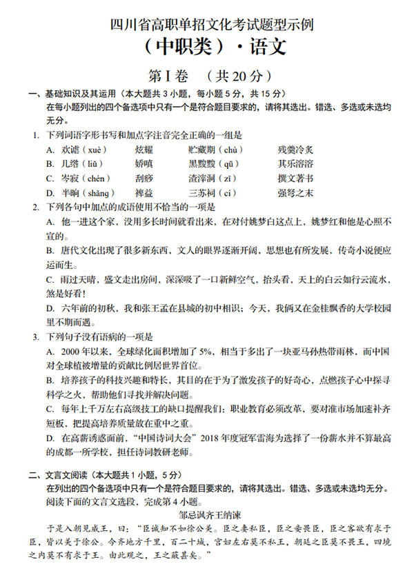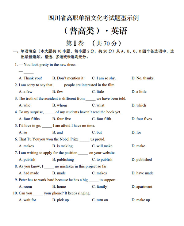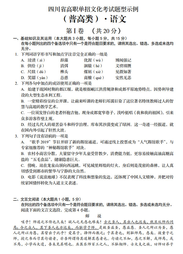 为便于考生高职单招文化考试备考,现将四川省2020年高职单招文化考试题型示例公布如下,供考生复习参考。由学校组织的技能综合测试的考试方式、要求等内容,请考生直接查询学校官网或电话咨询招生学校。