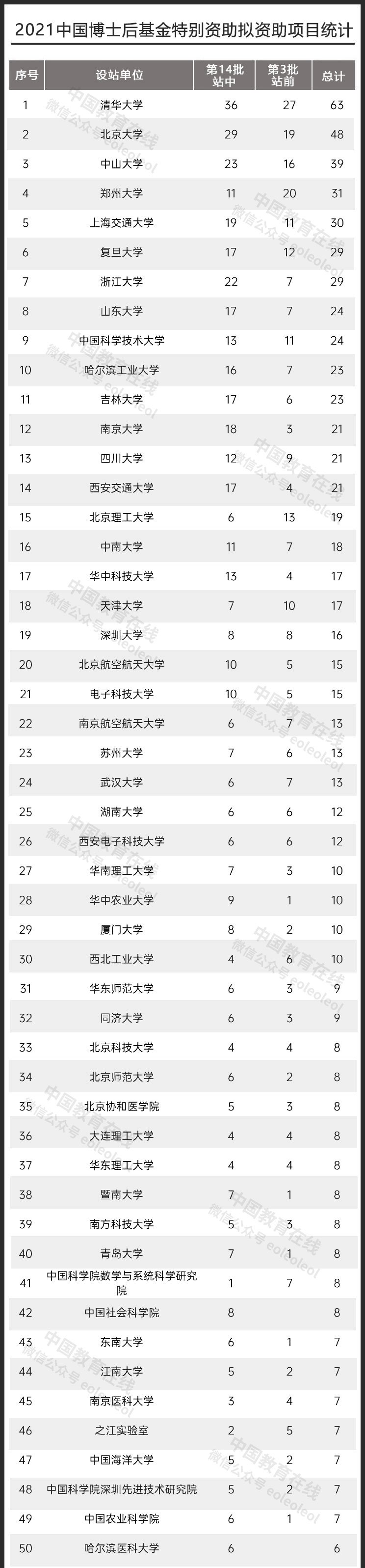 本次公示的特别资助人员(含第3批站前和第14批站中)依托单位主要来自高校、科研院所和企业等单位。据统计,清华大学拟入选人员最多,共63人;北京大学拟入选48人;中山大学拟入选39人。