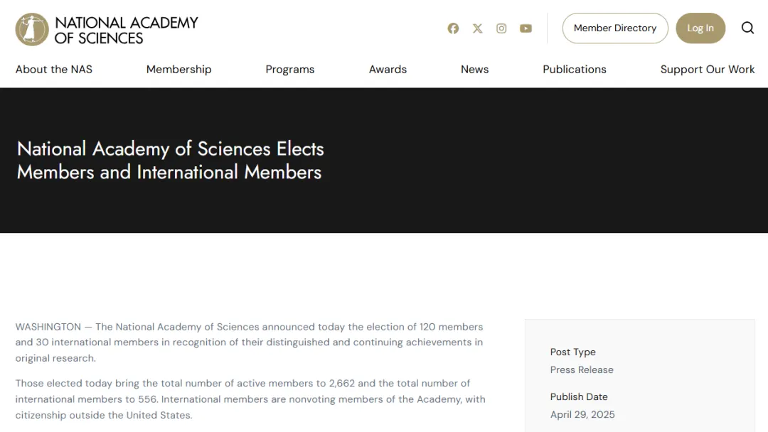 4月30日,美国国家科学院公布了新当选的院士和外籍院士。此次共计120名院士和30名外籍院士当选。诺奖得主、中国中医科学院青蒿素研究中心屠呦呦教授当选外籍院士。