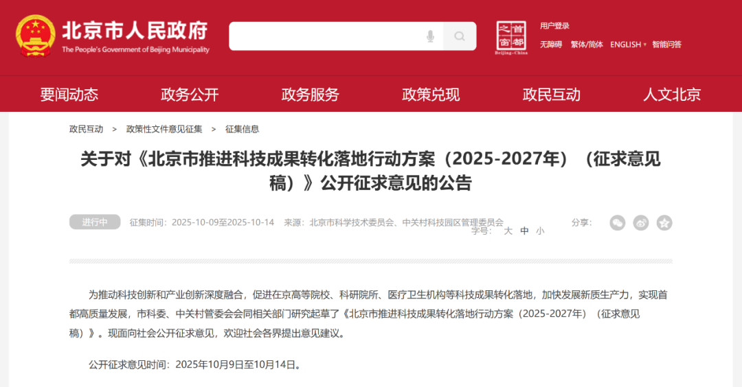 关于对《北京市推进科技成果转化落地行动方案(2025-2027年)(征求意见稿)》公开征求意见的公告