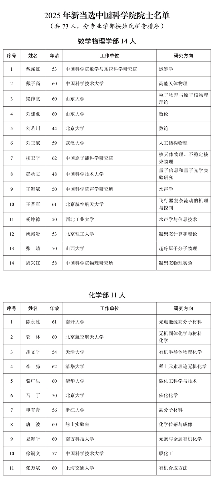 根据《中国科学院院士章程》《中国科学院院士增选工作实施办法(试行)》《中国科学院外籍院士选举办法》等规定,2025年中国科学院选举产生了73名中国科学院院士和27名中国科学院外籍院士。