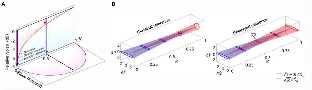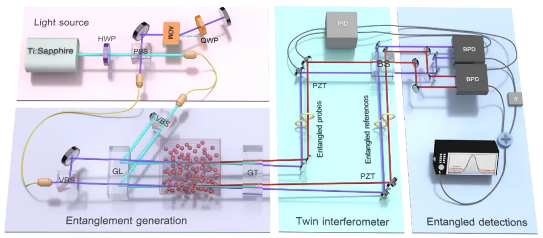 为突破此局限,团队构建了互为纠缠的“量子孪生干涉仪”,取代现有的平衡零拍探测。基于并行配置的双对孪生纠缠光束,团队建立了量子关联干涉与纠缠探测协同的相位测量新范式。这一成果成为量子计量学向前迈进的又一里程碑。