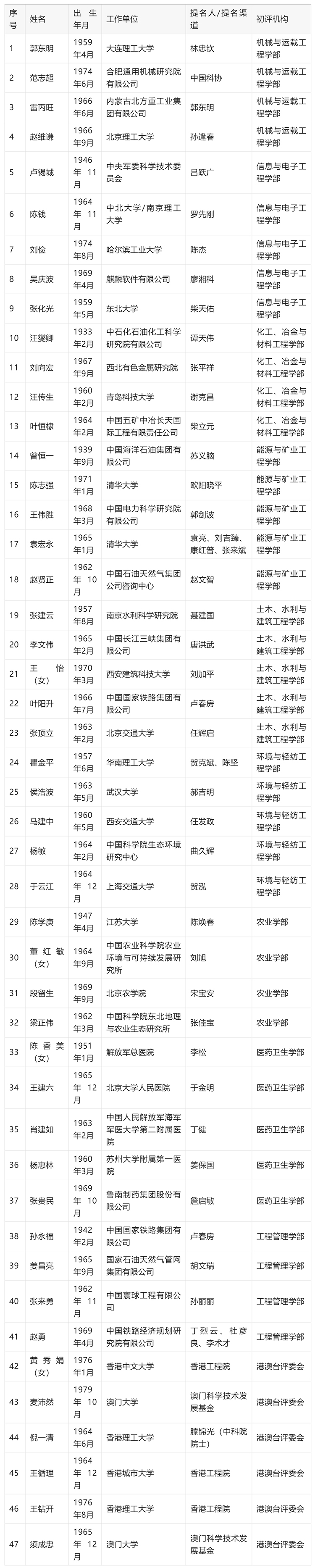 第十六届光华工程科技奖初评工作已经结束。经初评,共产生47位候选人进入终评,根据《光华工程科技奖管理办法》,现将通过初评的候选人名单予以公布。