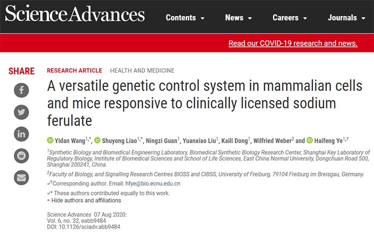 上周,华东师范大学生命科学学院、医学合成生物学研究中心研究员叶海峰团队在《科学进展》在线发表最新研究成果,他们利用合成生物学的设计思路,历时六年,研发了一种安全高效的天然绿色小分子、临床批准药物阿魏酸钠调控的基因控制开关。