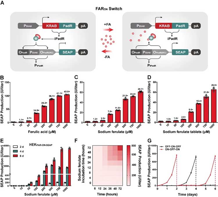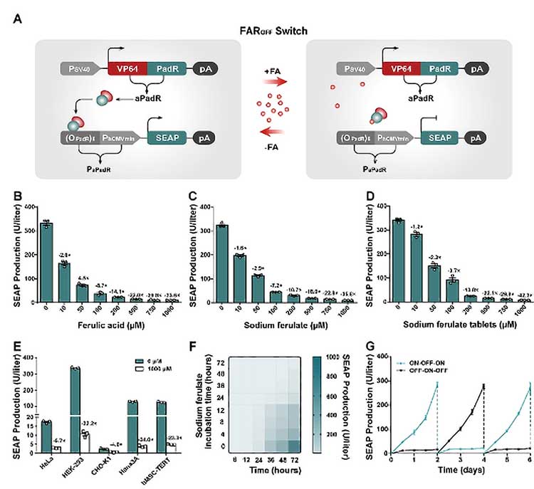 研究团队利用枯草芽孢杆菌168中padA基因的转录调节抑制子PadR,能够在环境中存在阿魏酸时,从它特异的DNA结合序列上解离这一特性,成功构建了阿魏酸/阿魏酸钠调控的基因开关(FAR switch),包含FAROFF switch(关)和FARON switch(开)两类。