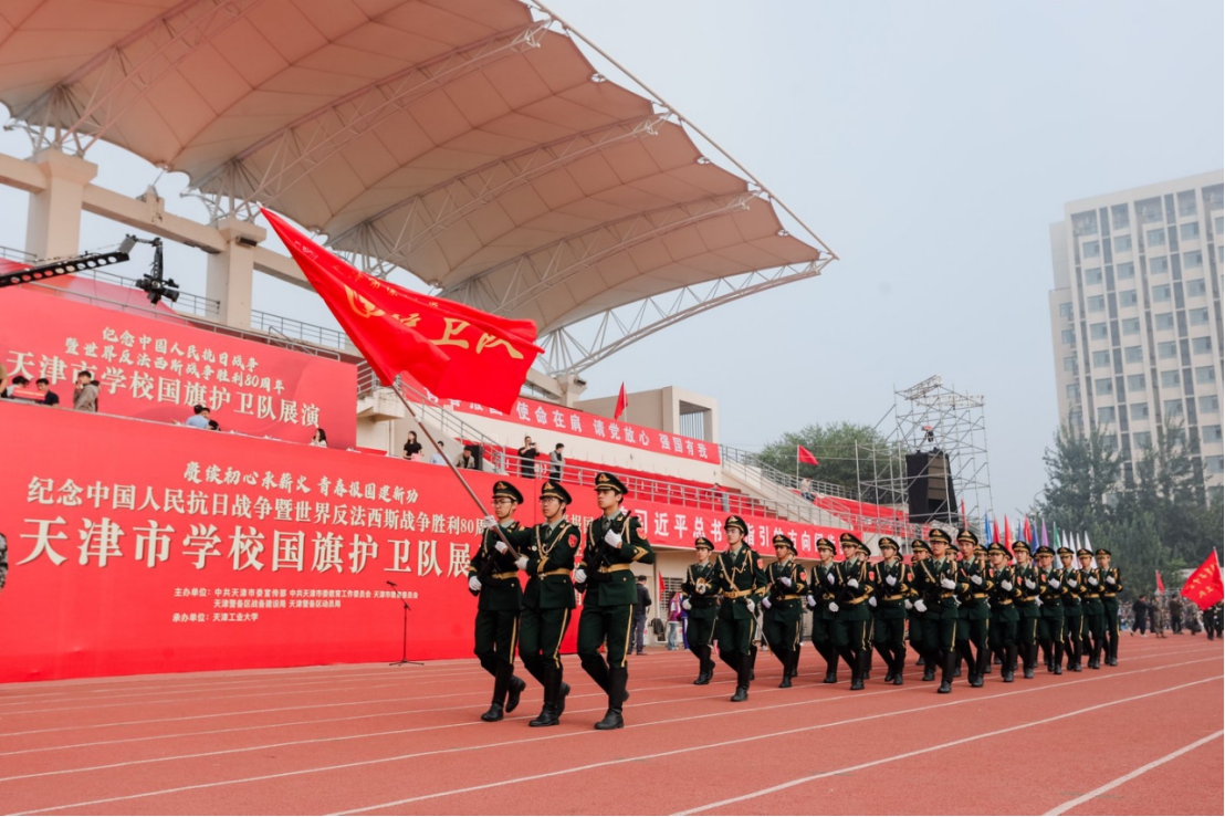 为深入学习贯彻习近平新时代中国特色社会主义思想和习近平强军思想,全面落实党的教育方针,围绕立德树人根本任务和新时代强军目标,切实加强天津市青少年学生国防教育,提升青少年国防意识,9月28日,由天津市委宣传部、天津市委教育两委、天津警备区战备建设局、天津警备区动员局主办,天津工业大学承办的纪念中国人民抗日战争暨世界反法西斯战争胜利80周年天津市学校国旗护卫队展演在天津工业大学望星运动场举行。