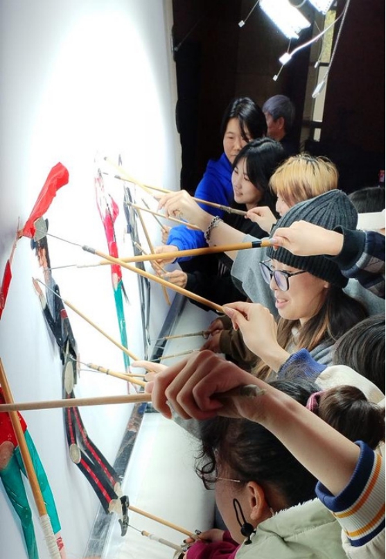 展演结束后,充满趣味的学生互动环节随即展开。在华州皮影团成员的指导下,同学们有序上台,亲手操控皮影道具,尝试编排简单的皮影动作。学生们在实践中感受皮影操控的独特技巧,现场欢笑声与讨论声不断,进一步拉近了青年一代与传统非遗文化的距离。