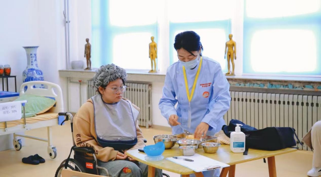 大赛中,学校滨城智慧养老产教融合实践中心充分发挥“教学+实训”优势,为赛事提供全场景支撑。赛场内,基础照护、生活照护、康复服务三大模块实操同步开展,选手们精准完成血压测量、翻身叩背、鼻饲进食、良肢位摆放等12项核心技能操作,更将安全防护、人文关怀贯穿全程。赛事设置“标准化老年人”角色,经专业培训的志愿者学生精准模拟老人身心状态,让实操考核更贴近真实服务场景。智能护理设备与传统技能深度融合,选手们在社区居家场景中规划照护方案,在机构场景中优化服务流程,充分展现“理论+实操+创新”的综合素养。