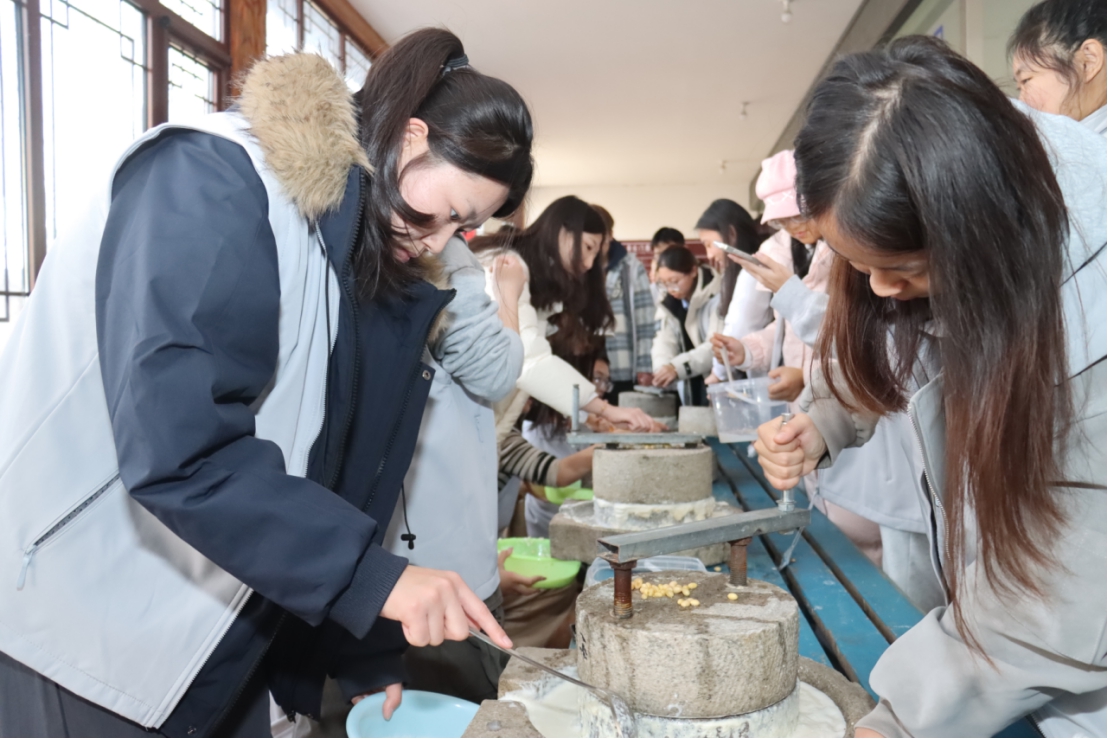 在非遗传承人的指导下,大家分组协作,选豆、推磨、滤浆、点卤,每一个步骤都凝聚着传统智慧。