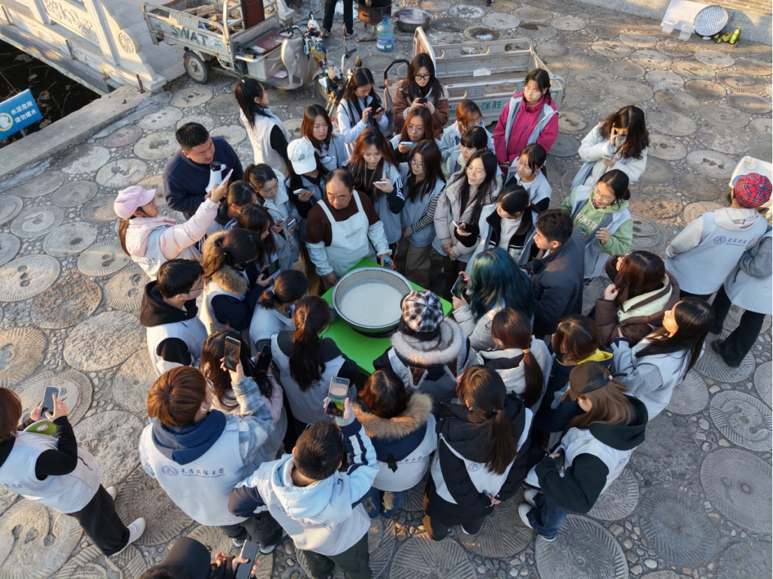 师生调研行第二站抵达天津市蓟州区上仓镇裕泉庄村,北方江南农坊呈现出另一番乡村振兴图景。这里依托“燕子李三故里”文化IP,打造集民俗展示、非遗体验、农耕文化于一体的特色农坊。最让同学们兴奋的是亲身体验石磨豆腐制作。