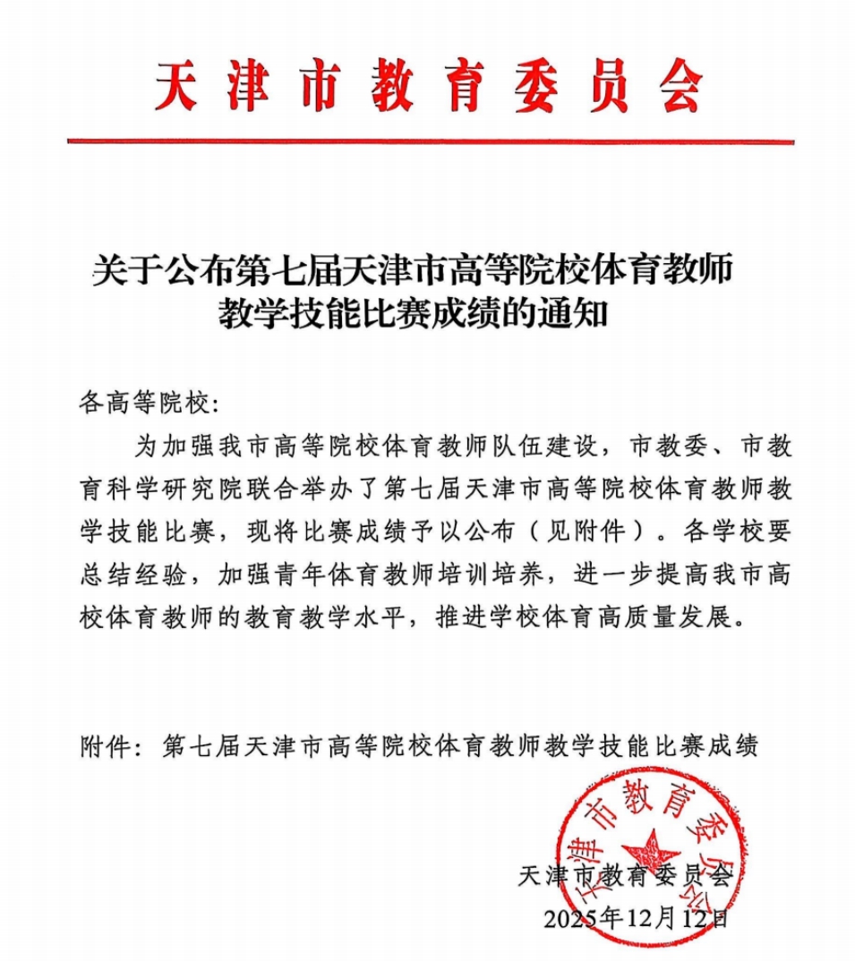 本次比赛由天津市教育委员会、市教育科学研究院联合主办,旨在加强高校体育教师队伍建设,全面检验天津市高校体育教师队伍建设情况,展示高校体育教师的教学技能和综合素质。竞赛内容涵盖理论知识和教学设计、课堂教学录像、运动技能测试、体能测试等多个测试项目,全面考察教师的专业理论水平、教学实践能力和体育专项技能。李龙、杨宇宁老师赛前深耕教学细节,反复打磨课程方案与技术动作,最终以新颖的教学设计、生动的课堂呈现和扎实的专业功底征服评委。其中,李龙老师在专项技能展示和教学理论考核中表现亮眼;杨宇宁老师则在教学展示和教学设计中展现了扎实的基本功和课程创新能力。