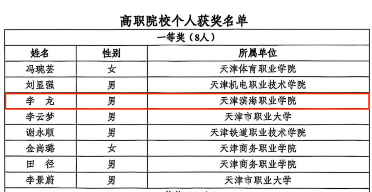 近日,由天津市教育委员会主办的第七届天津市高等院校体育教师教学技能比赛圆满落幕,在全市高校教师的激烈角逐中,天津滨海职业学院两位教师脱颖而出,为学校赢得了荣誉。其中,李龙老师荣获一等奖,杨宇宁老师荣获三等奖。