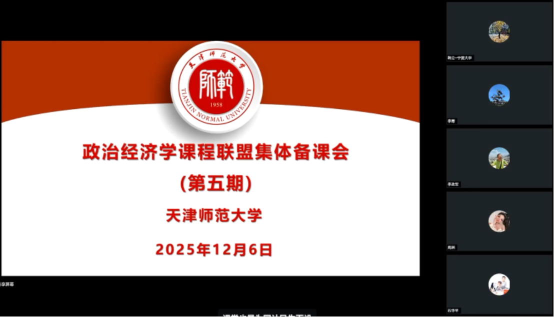 2025年12月6日,由天津师范大学经济学院承办的全国政治经济学课程教学联盟第五期集体备课会在线上举行。全国14所高校的33位任课教师齐聚“云端”,围绕《马克思主义政治经济学概论》(第二版)第五章 “资本主义生产”,通过说课展示、跨校议课、专家点评等环节凝聚教学共识,助力课程教学质量提质增效。