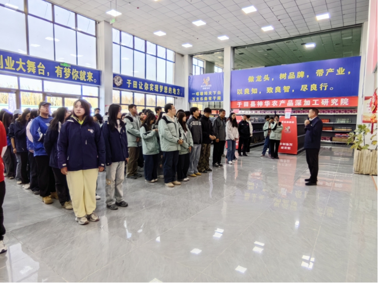 在汉疆飞马乡村振兴成果馆内,一幅幅真实影像、一件件特色产品,全方位展现了于田县在乡村振兴战略推动下的巨大变迁。支教团师生在展区前驻足,聆听相关负责人介绍天津援疆项目在基础设施建设、特色产业培育、民生保障改善等方面的丰硕成果。同时还了解到支部书记直播带货新模式,以“接地气”的互动方式讲述特产背后的地域文化故事,将和田各类特产推向全国消费市场,持续打造具有鲜明边疆标识的特色品牌。