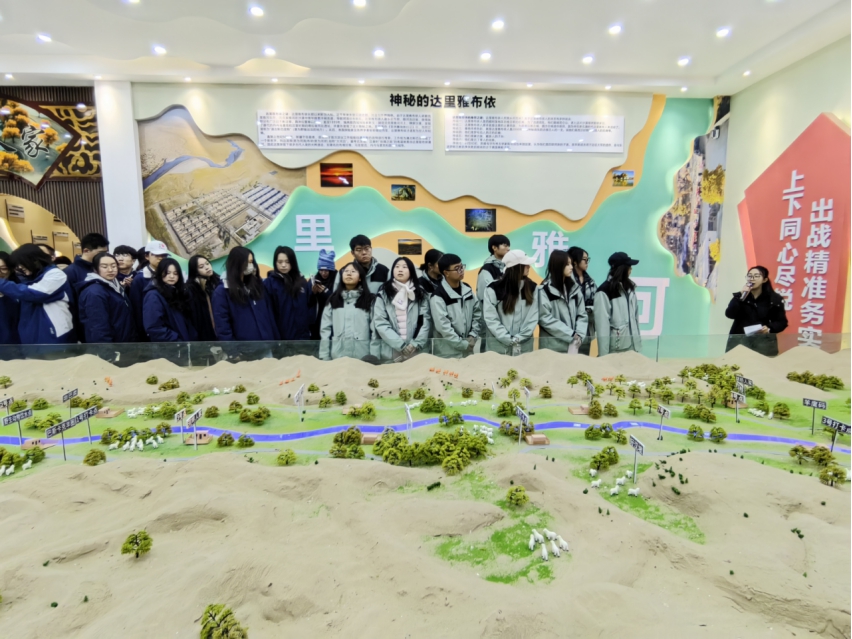 支教团师生在天津市对口支援新疆工作前方指挥部于田县工作组的带领下前往达里雅布依,跟随党校老师来到展厅,系统了解达里雅布依的历史沿革与发展现状。党校老师结合当地独特的地理环境与生态条件,详细介绍了达里雅布依在沙漠治理、生态保护以及区域发展中的重要地位,以及在国家脱贫攻坚政策扶持下,当地居民搬迁至新村,人民幸福感显著提升,更有当地的孩子学成之后反哺家乡,参与到家乡的建设之中。