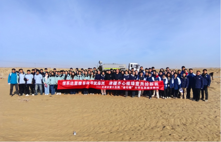 随后,支教团师生前往沙漠腹地开展防沙治沙种植沙枣活动。在工作人员的指导下,大家分工协作,完成挖坑、栽种、培土等种植流程。面对沙地松软、气候干燥等实际困难,大家相互配合、密切协作,始终保持积极的劳动热情。一株株新栽下的树苗在沙地中稳稳扎根,为广袤的沙漠增添了一抹生机与绿意,也寄托着支教团师生们对生态改善与可持续发展的美好期望。
