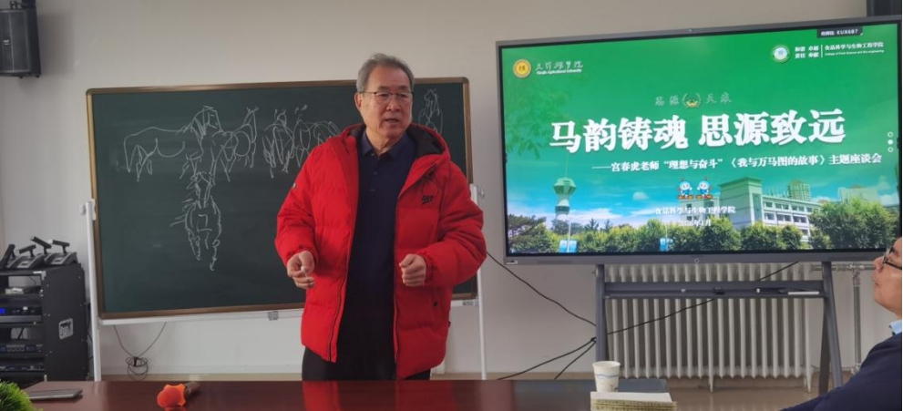 1月15日,天津农学院食品科学与生物工程学院联合马克思主义学院共同开展“马韵铸魂·思源致远——宫春虎老师《我与万马图的故事》”主题活动。天津农学院党委书记李鑫、党委副书记宋涛出席活动。活动以当代画马名家、徐悲鸿先生再传弟子、中华画马学会执行会长宫春虎老师的《万马图》为核心纽带,集画作展示、艺术分享、思政宣讲、互动交流于一体,为师生代表及食品科学与生物工程学院校友,献上一场兼具文化底蕴与精神力量的马年文化盛宴。