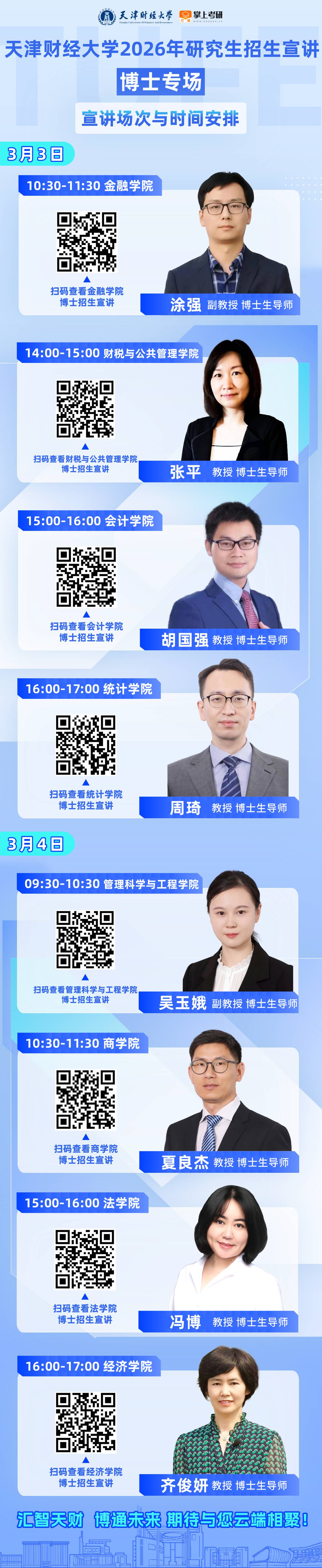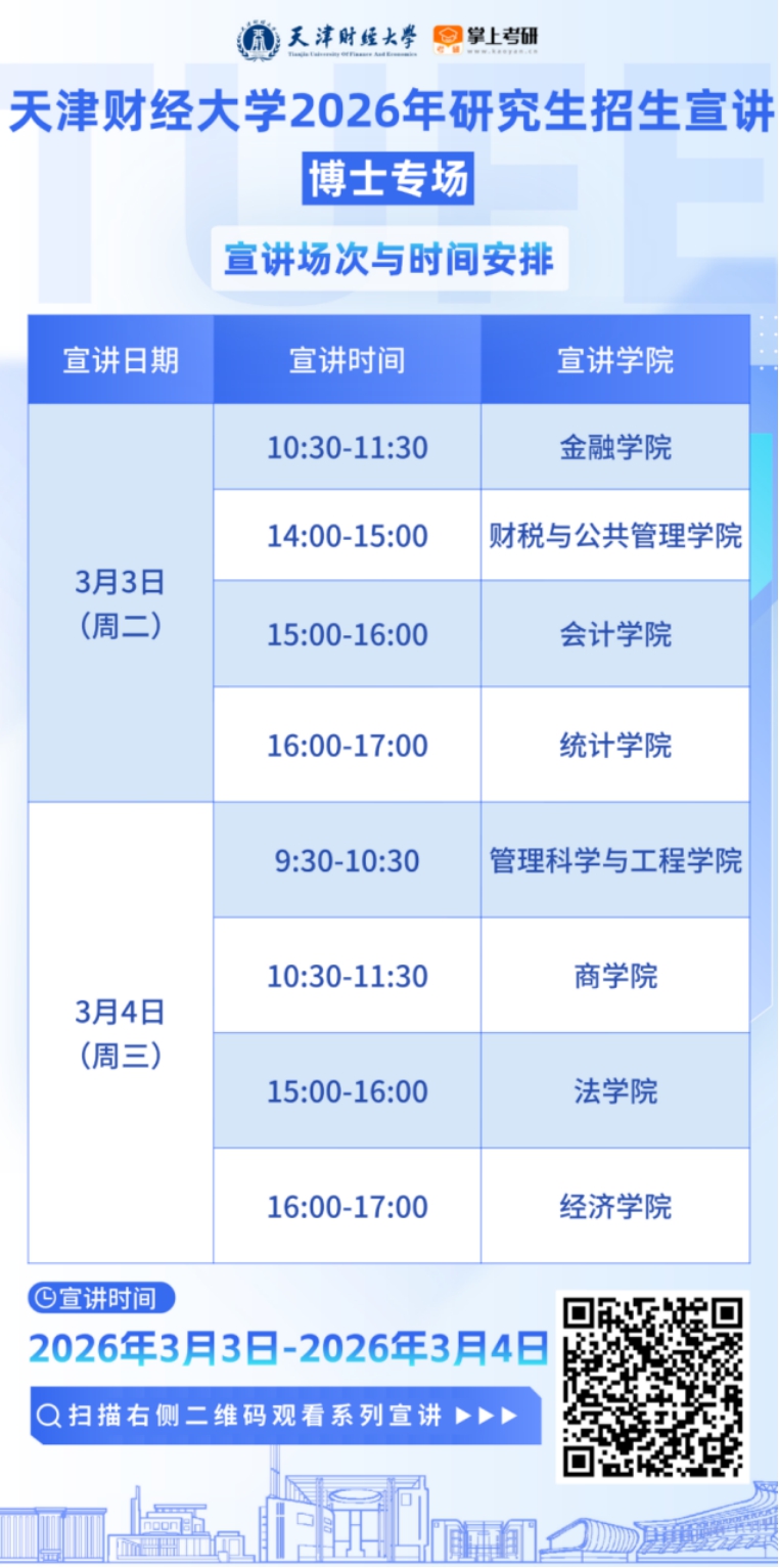 汇智天财 博通未来│ 3月3日-3月4日 天津财经大学2026年博士生招生直播宣讲重磅启动!