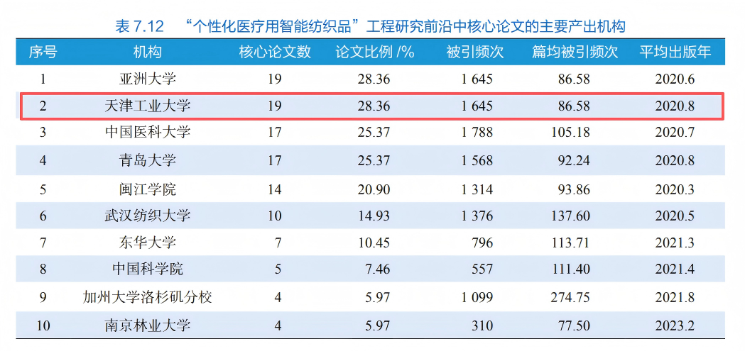 “个性化医疗用智能纺织品”是纺织工程、微电子、信息科学与生物医学深度交叉融合的前沿方向,入选中国工程院环境与轻纺工程领域Top10工程研究前沿,已成为纺织科技跨界融合发展的代表性领域。报告显示,我国在该领域科研产出优势显著,核心论文和施引核心论文占比均位居世界第一。其中,核心论文占比达91.04%,施引核心论文占比达64.45%,充分表明我国在该研究方向上已形成强大的原创能力和国际学术影响力。作为主要产出机构之一,天津工业大学并列全球第一,充分体现了学校在该领域持续深耕所取得的重要成果。近年来,学校紧紧围绕纺织科学与工程学科国家“双一流”建设目标,持续优化学科布局,强化有组织科研,先后成立天津工业大学纺织未来技术研究中心、先进纺织复合材料学科交叉中心、纺织复合材料及其装备学科与技术中心等高水平科研平台,不断拓展纺织学科发展新空间。学校坚持“四个面向”,深度汇聚纺织科学、材料科学、信息科学、人工智能、数学、控制科学与工程等多学科资源,聚焦未来产业和科技制高点,着力打破学科壁垒,构建交叉融合创新生态。在交叉学科建设方面,学校主动服务新工科发展和国家战略需求,自主设置智能可穿戴技术与工程等9个交叉学科博士点,着力培养具有家国情怀、国际视野、跨学科思维和创新能力的高层次复合型人才。2026年,学校入选教育部教育强国建设三年行动计划综合改革试点单位,承担“学科专业设置调整优化机制改革试点”中“新兴交叉学科建设路径”试点任务,进一步为学校高质量发展注入新动能。下一步,学校将立足纺织学科特色优势,持续深化学科交叉融合,强化前沿技术攻关,加快创新成果转化,努力产出更多具有引领性、标志性和国际影响力的高水平成果,为建设纺织强国、加快实现高水平科技自立自强作出新的更大贡献。