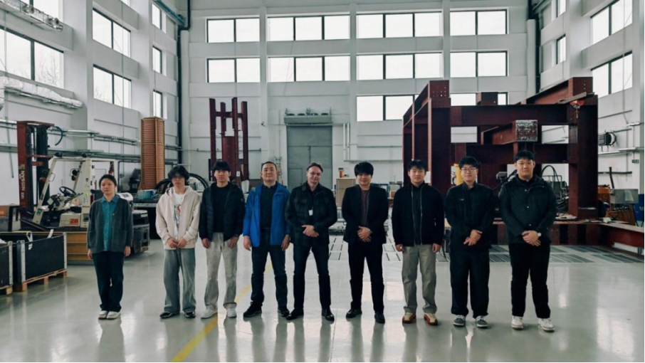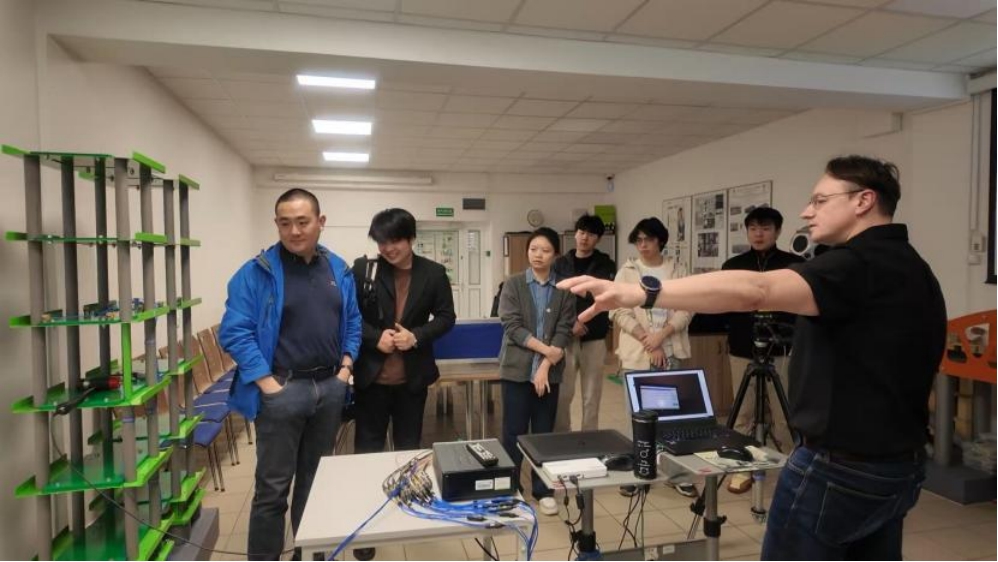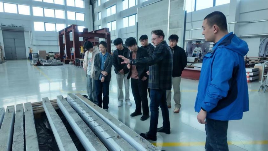 随后,师生们走进建筑结构动态实验室。这里聚焦于结构动力学、抗震性能评估等前沿方向,配备先进的动态加载与实时采集系统。Krzysztof教授现场展示了一场抗震模拟实验,深入讲解了动态加载原理、数据采集流程及其在欧洲规范体系下的实际应用。相较于基础实验室,这里更侧重复杂荷载条件下结构响应的高端研究,融合了多学科交叉与智能化监测技术。“过去觉得振动台很神秘,现在亲眼看到它如何模拟地震,并实时反馈结构的每一丝‘颤抖’,书本上的知识立刻活了过来。”学生李裕元兴奋地表示。同学们在Krzysztof教授引导下,不仅对结构工程的前沿进展有了系统性认识,也真切地感受到实验研究如何直接服务于工程安全与实践创新。