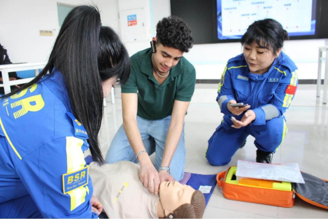 (国际学生在蓝天救援队指导下体验心肺复苏)