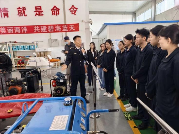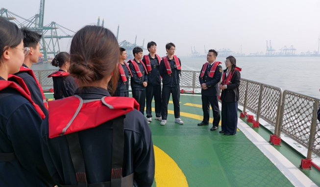 师生们登上“海巡船”,海风拂面,涛声在耳,这堂课进入了最“摇晃”也最生动的环节。东疆海事局海巡执法大队副队长田海超结合船载设备与实战案例,讲解海事人员在巡航执法、应急搜救中的职责与担当。