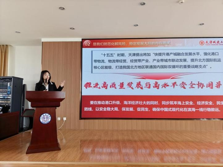 揭牌仪式后,天津城建大学思政课教师崔梦影现场讲授了题为《统筹发展和安全 护航“十五五”新征程》的微课程。她结合国际航运风险与天津港的枢纽角色,阐释了守护海上国门、保障战略通道的现实意义。“海上安,城市安;海事安,大局稳。”崔梦影表示,港口安全不仅是国家战略的体现,也直接关系到城市的经济发展与民生稳定。