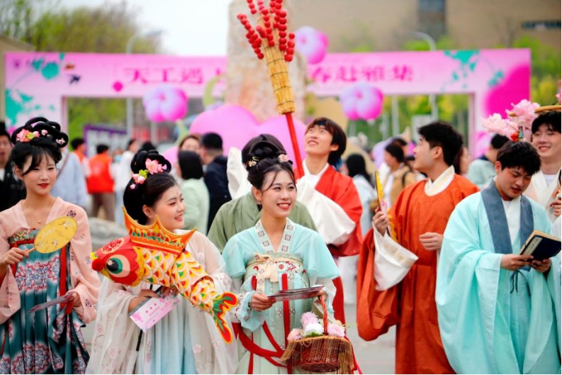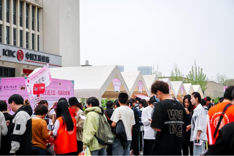 4月16日,农历三月三前夕,天津工业大学第三届中华传统文化体验日在东苑食堂广场启幕。“开市喽——”随着一声吆喝,鸣锣开市仪式还原了千年前上巳节的古礼。身着汉服的学子们手持兰草,在祓禊仪式中依次净手祈福,引得围观师生纷纷举起手机记录这一幕。广场上,30个特色展位与体验区呈“回”字形排开,铜艺香、糕点香、墨香交织弥漫,近千名师生共赴传统文化雅集。