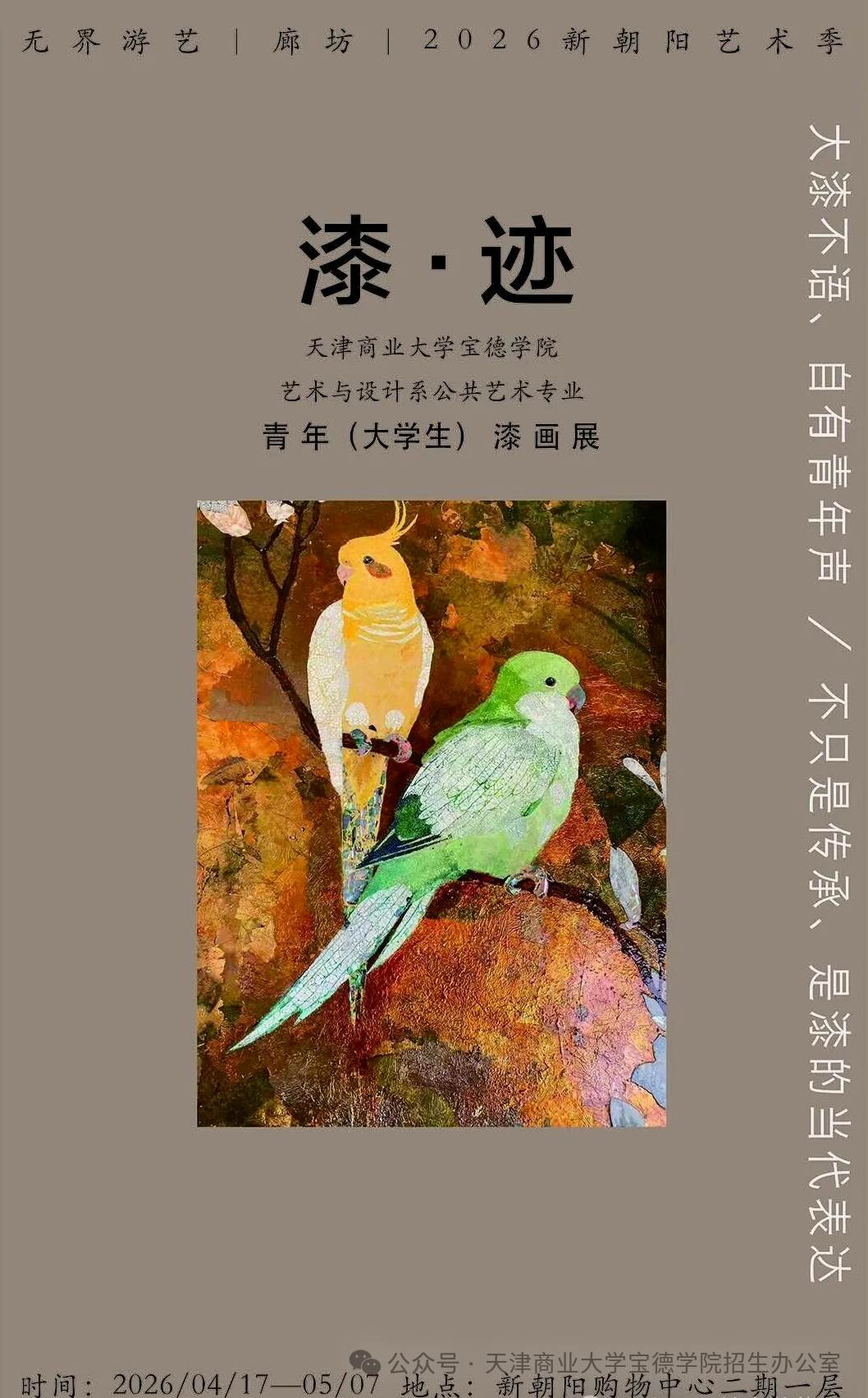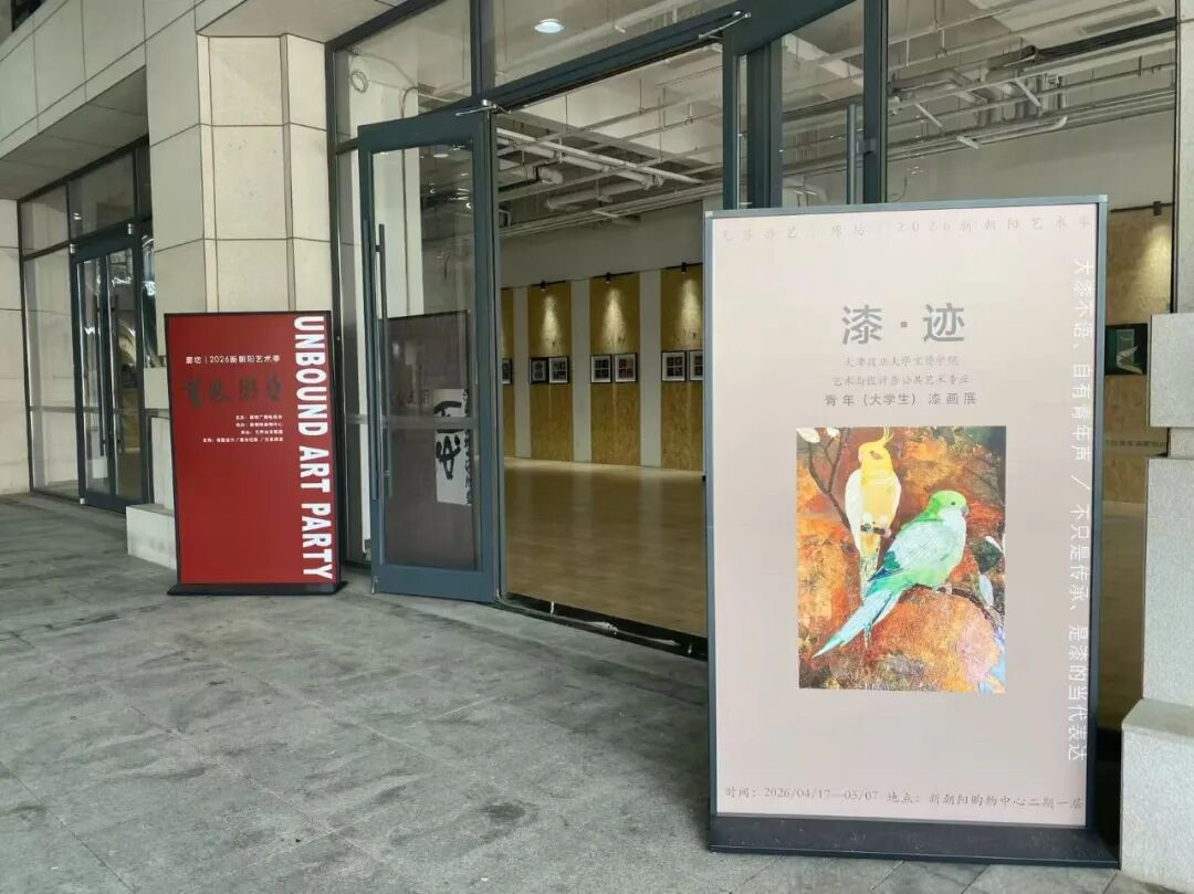 近日,天津商业大学宝德学院艺术设计系公共艺术专业漆画课程教学成果,走出校园、走向公共空间,在廊坊新朝阳购物中心二期精彩亮相——作为“无界游艺|廊坊|2026新朝阳艺术季”核心展览之一的《漆·迹》青年(大学生)漆画展,正式拉开帷幕。这是天津商业大学宝德学院漆画课程教学成果的校外集中展示,也是学校助力京津冀文化协同发展、践行非遗活态传承的生动实践。