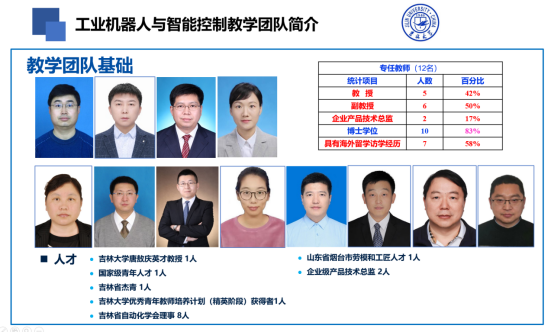 本微专业教学团队由李新波,胡云峰,李寿涛,许芳等四位教授,洪伟,刘振泽,唐志国,李明阳,张涛,刘云六位副教授,及企业的两位具有丰富实践经验的高级工程师组成,其中不乏吉林大学优秀青年教师培养计划(精英阶段)获得者,控制学科带头人 ,来自高端企业的一线研发人员和具有丰富经验的高级工程师等优秀人物。教学团队结构合理,构成多元,开放包容,充分展现控制科学与工程的鲜明特色,更好的契合学科交叉与创新驱动的学术需求,致力于培养更多的符合社会经济需要的高水平复合型创新人才。
