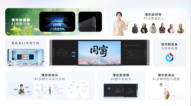 对于学生,是守护与陪伴。 全球首款圆偏振自然光护眼大屏,将视觉疲劳降低50%;130°超宽域显示与24阵列喇叭,让“教室每个座位都是C位”。这超越了技术本身,是一种普惠、平等的温暖。而“AI同窗”通过苏格拉底式的诘问守护好奇心,通过多模态实录生成个人成长档案,它在默默陪伴和记录每一个独一无二的成长瞬间。