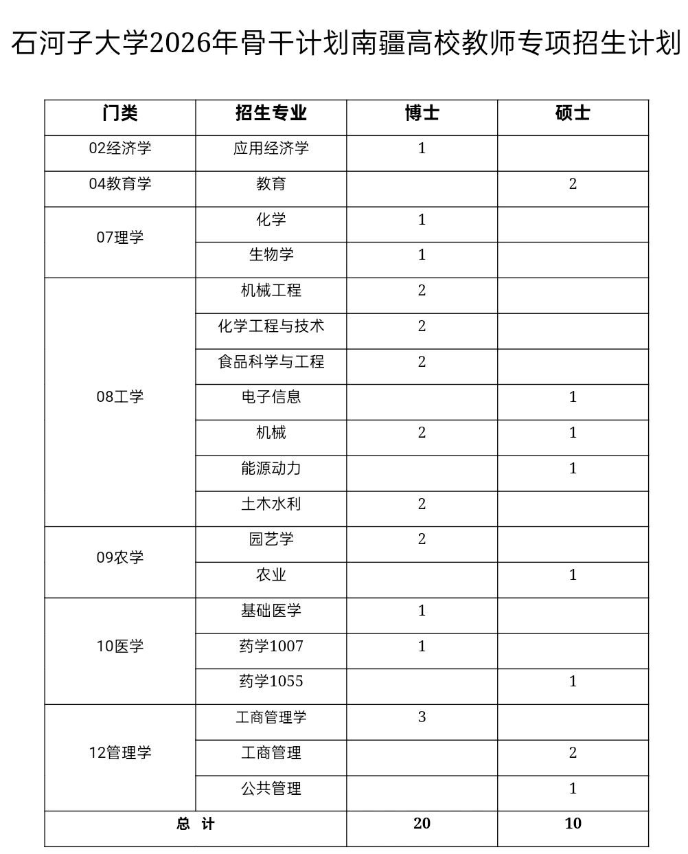 石河子大学2026年新增骨干计划南疆高校教师专项招生计划。