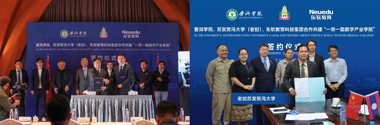 在老挝人民革命党中央委员会总书记、老挝人民民主共和国主席通伦·西苏里对中国访问半月不到,云南普洱学院、老挝苏发努冯大学、东软教育科技集团三方于12月12日在云南省普洱熙康云舍酒店举行共建“一带一路数字产业学院” (英文简称:PUSUNE Digital College)的签约仪式,这意味着中国第一个国际数字产业学院在普洱学院落地。三方通过在高等教育、职业教育的数字技术人才培养以及数字化创业教育,为老挝培养数字技术人才,落实中老双方联合声明中进一步深化中老命运共同体建设的目标,通过教育合作推动东盟国家的数字经济发展。普洱学院校长马文会,普洱学院副校长田洋,东软创始人、东软教育科技集团董事长刘积仁,东软教育科技集团高级副总裁李印杲等出席活动。云南省教育厅对外交流与合作处处长王源,普洱市副市长吴学榕,老挝苏发努冯大学副校长苏立特等在线参会。