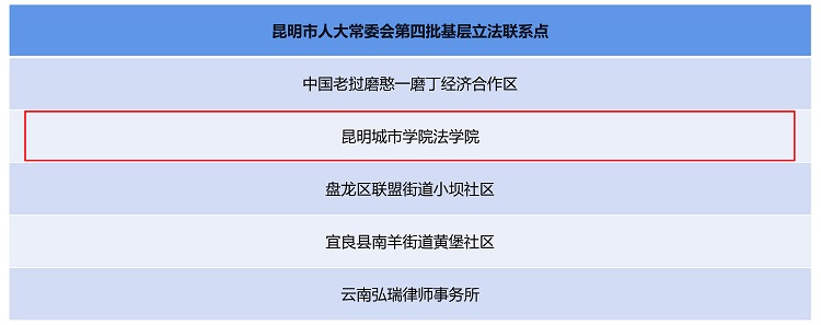 根据昆明市人大常委会办公室发布的通知,昆明城市学院法学院等5家单位被列为第四批基层立法联系点。
