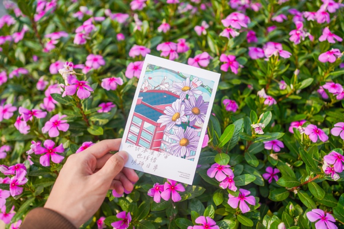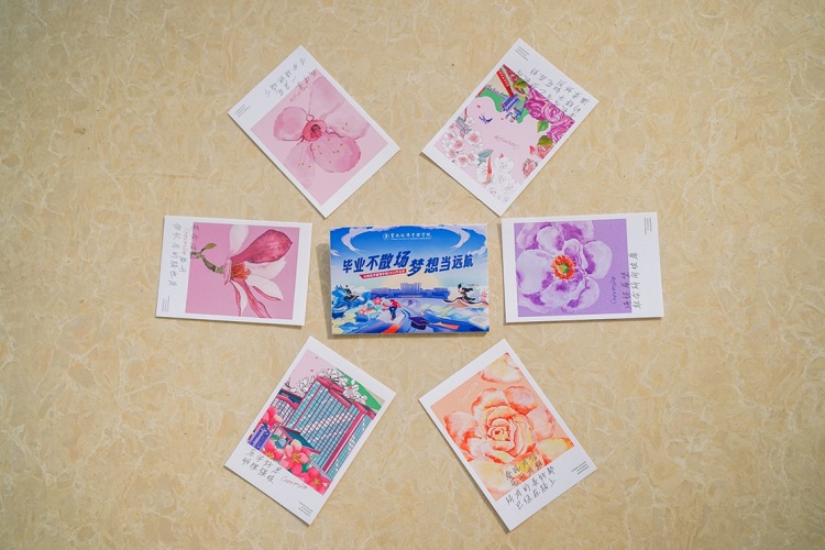 一张张手绘明信片,将珍贵的画面定格,体育馆搭配上粉色樱花,综合楼点缀白色海棠,不同的场景,皆是回忆。小小的明信片收藏了学校如画的美景,也收藏了属于他们的青春记忆。
