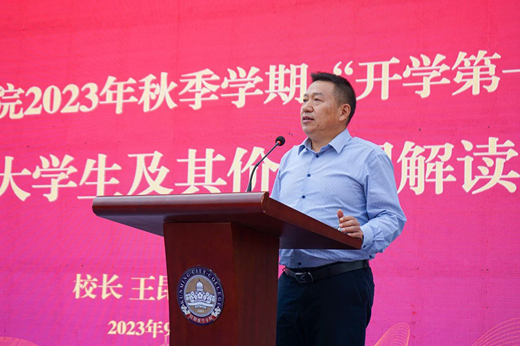 王昆来以《当代大学生及其价值观解读》为题授课。他从自画像、生理特征、情智特征、经济特点、生活空间、人际交往、人生任务、语言特点、行为方式等维度对当代大学生的形象及状态进行了阐述。他指出,大学生是为了实现自己的人生目标和满足未来的职业需要,通过高考进入大学,进行高等教育的特殊学生群体;而在座的各位新生也是深受互联网和科技力量影响的“Z世代”人群,有着自己显著的特征。