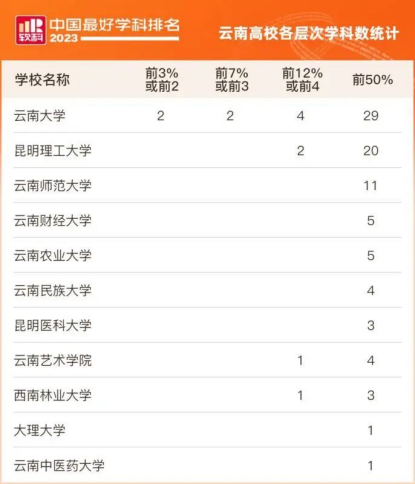 从此次高校上榜学科数来看,云南大学以上榜学科总数29个位列全省第一;其次是昆明理工大学,共有20个学科上榜;此外,上榜的高校还有云南师范大学(11个)、云南财经大学(5个)、云南农业大学(5个)、云南民族大学(4个)、云南艺术学院(4个)、昆明医科大学(3个)、西南林业大学(3个)、大理大学(1个)以及云南中医药大学(1个)。